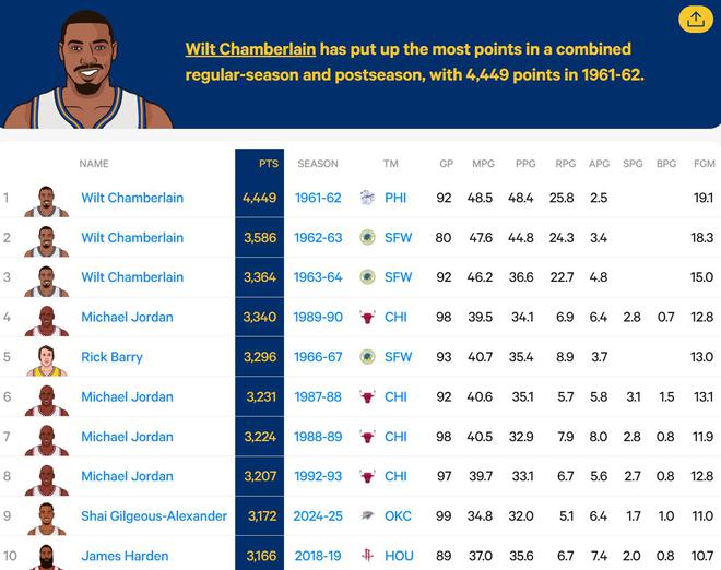 乔丹后首人,亚历山大单赛季砍3172分排历史第九